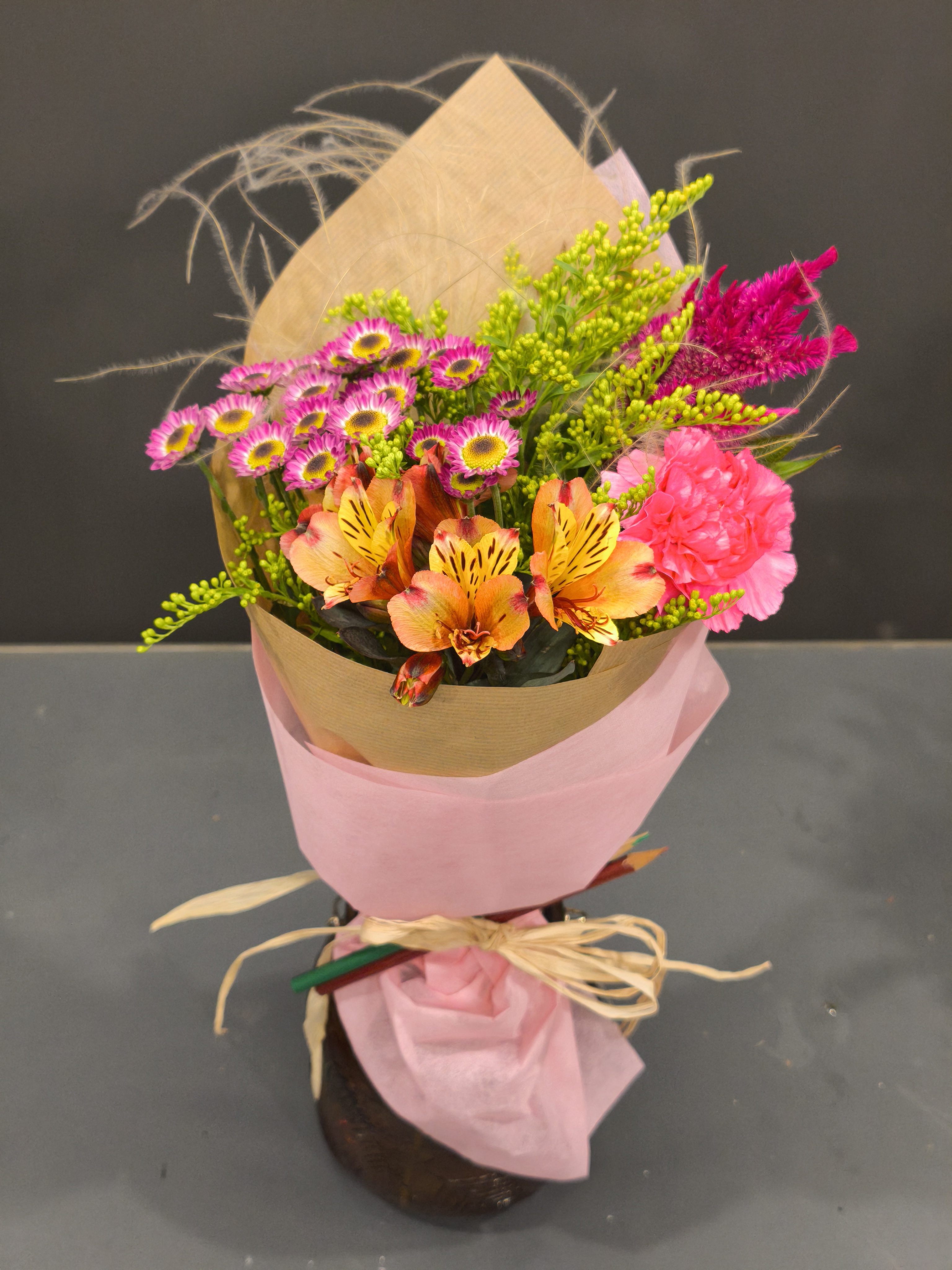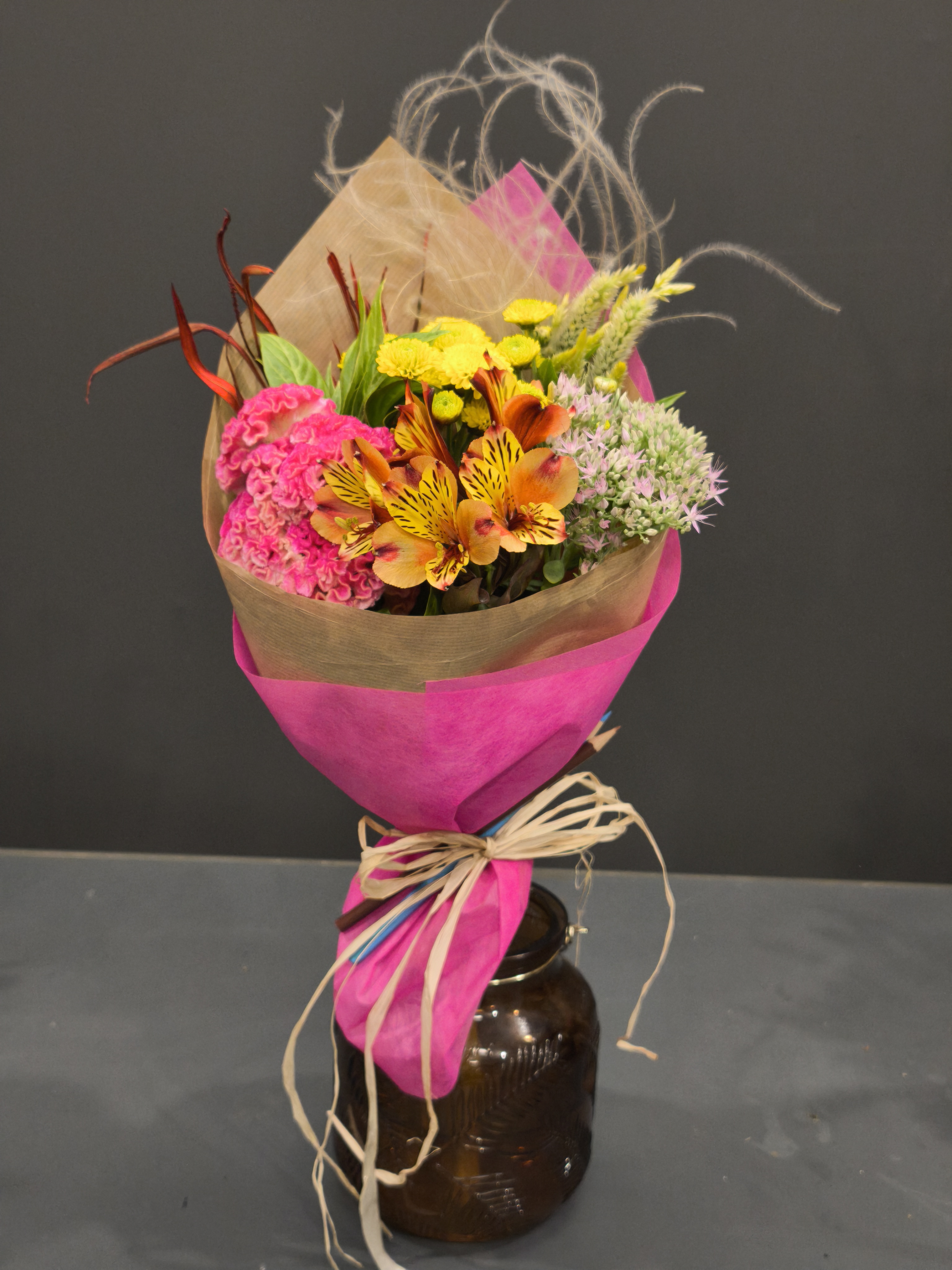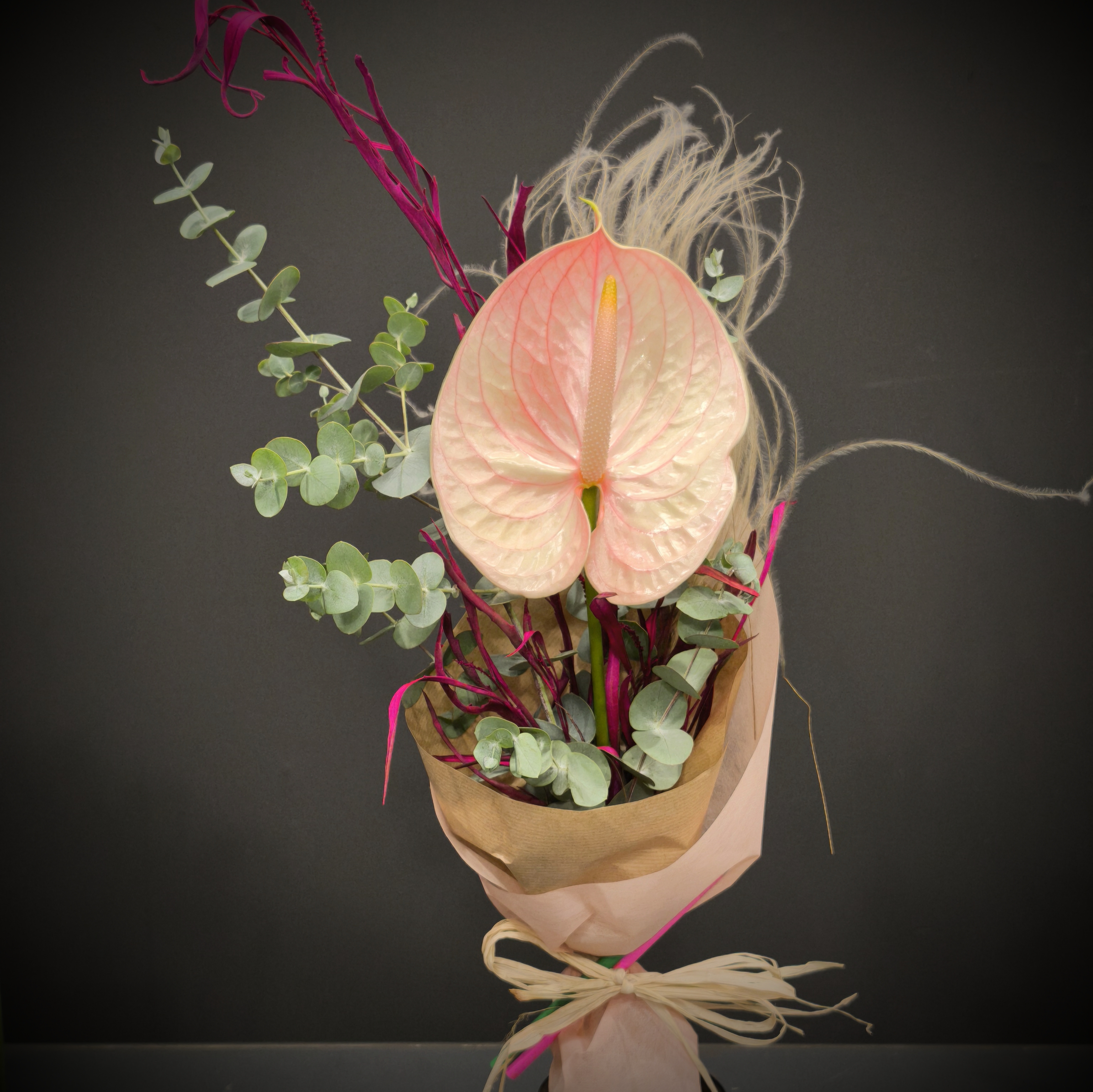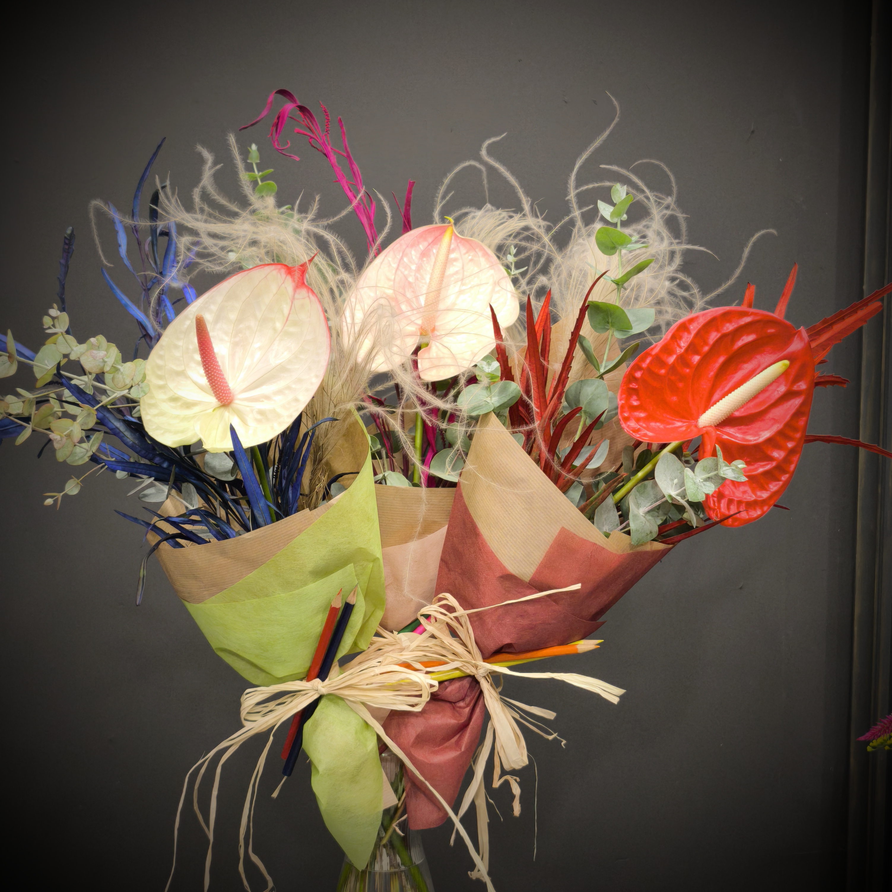Елегантен екзотичен букет с Антуриум и зеленина. Опаковка тип рециклирана хартия и текстил, завършен със моливи и панделка от канап.
